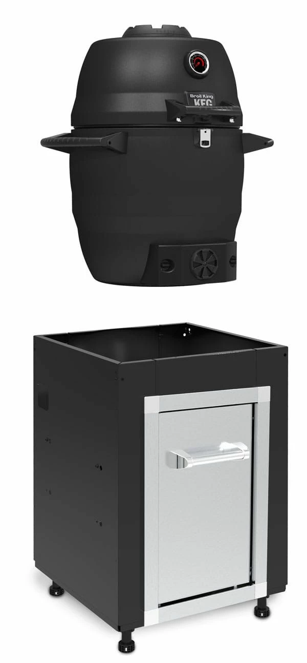 Durable steel construction, premium powder-coat epoxy paint finish, built-in steel storage shelf or Broil King Keg support, four sturdy leveling feet and stylish stainless steel door with stainless steel door trim kit.