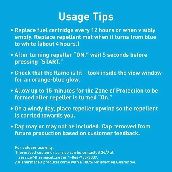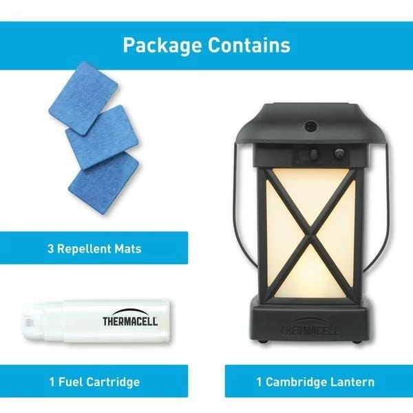 - Package contains: 1 lantern and 12 hours of refills – 3 repellent mats and 1 fuel cartridge. Requires 4 AA-batteries (not included)